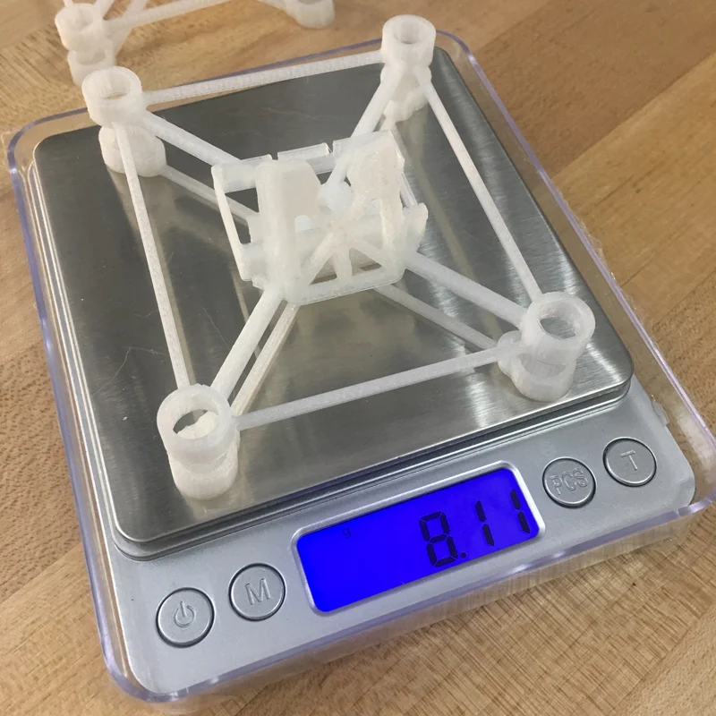 I then discovered NylonX, a super stiff carbon/nylon blend that retains the resilience of pure nylon. I shaved the frame down even more, and got it down to 3.56 grams (just .34 more than stock). Finally I'm down below 20g.