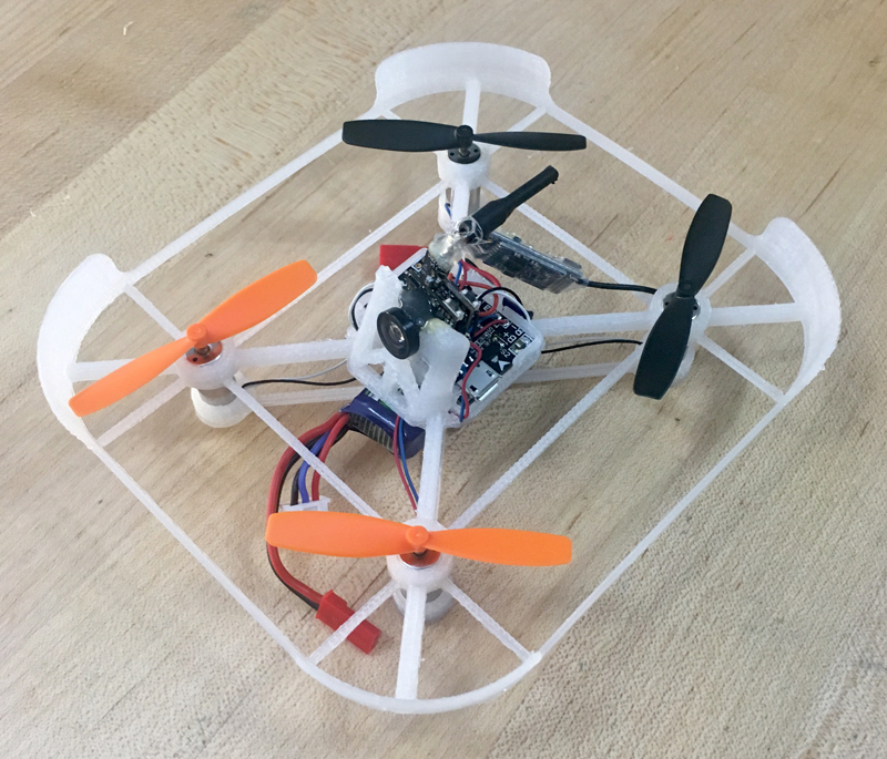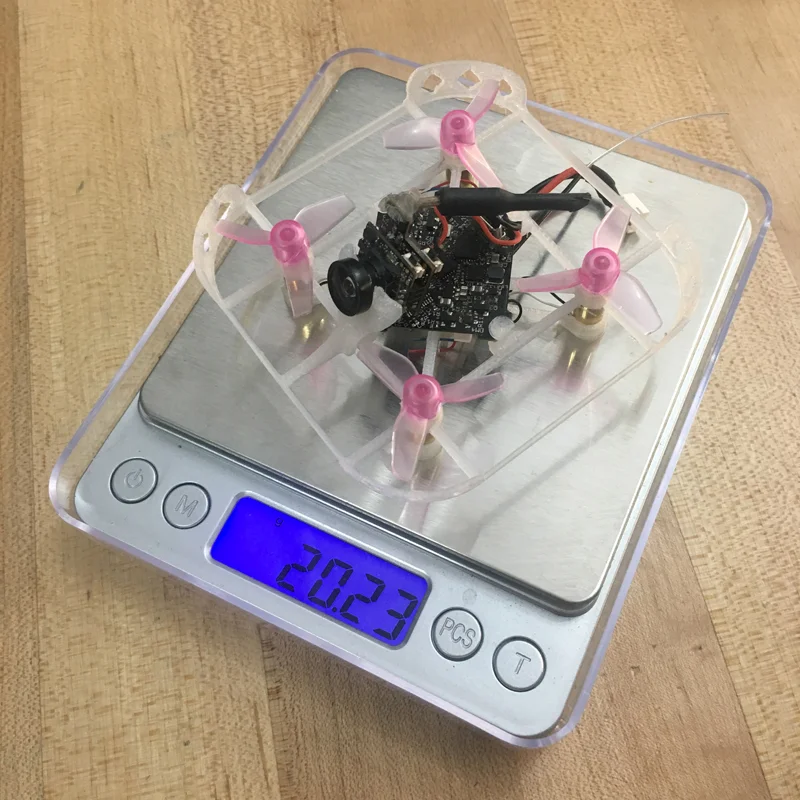 It sure was pretty (to me at least) for a prop guard frame, but those curved connectors proved to be almost useless. They easily compressed and elongated, adding little rigidity. It was also porky – the top alone was 14.4 grams. When the parts finally showed up I threw them on and found that...it could barely lift off. I was hoping that 8mm motors would be way more powerful, but I guess not.