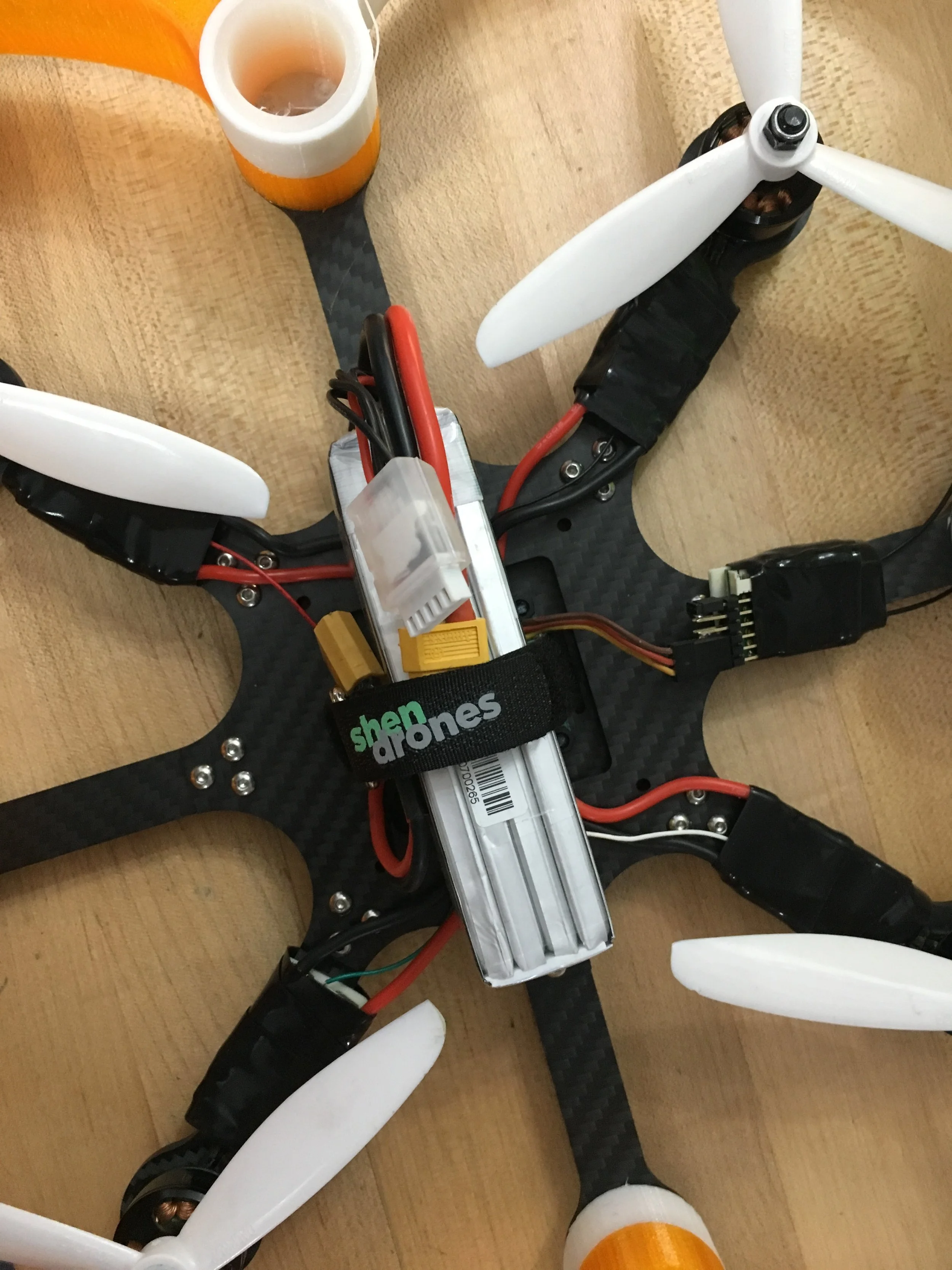 The battery rides above the FC. I was going to put some pads underneath, but the motor wires function just fine as padding.