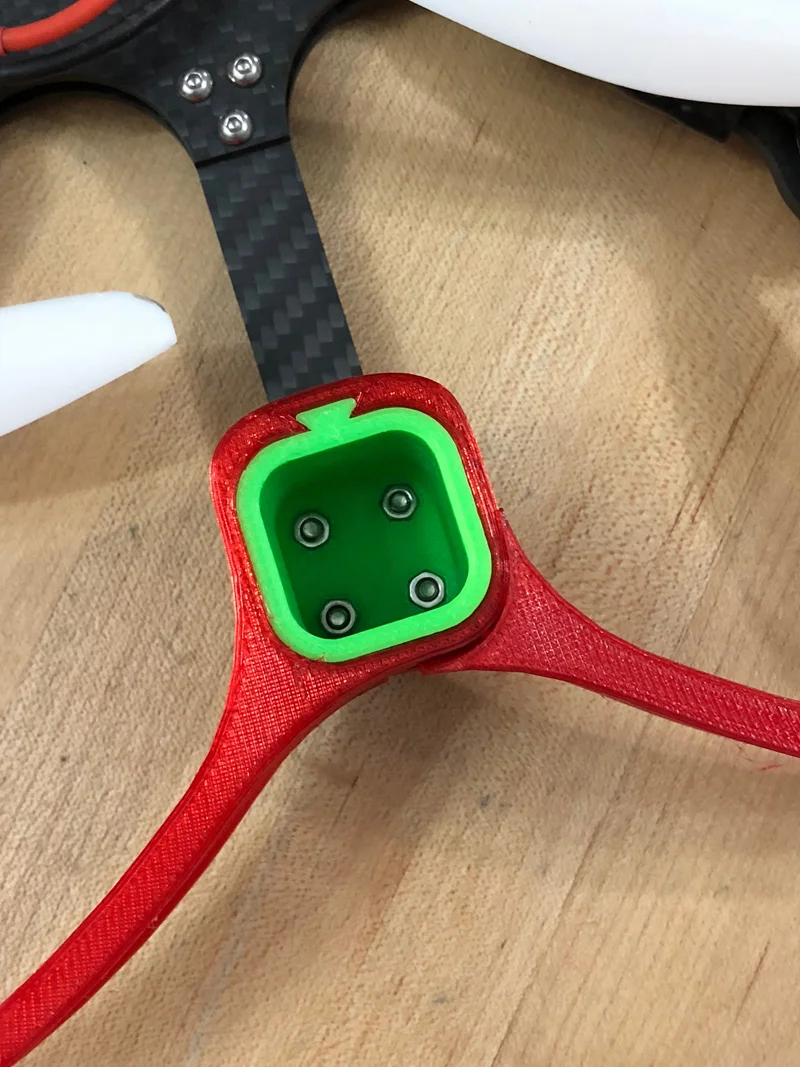 So we're talking about a 6" quad that's somewhat modular, with attachment points for weapons. Obviously it has to be strong, but if the prop guards could act as shock absorbers the hard edge of impacts can be lessened. The biggest challenge was the propguards: how do you suspend them beyond the props without adding a lot of weight, and how do you make them rigid enough to not easily bend into the props, while being flexible enough to be durable and act as bumpers. Finally, I wanted to break up the frame into smaller parts that are cheaper to produce, and I wanted fewer different parts so you don't need to stock a lot of spares. Here's what I came up with.