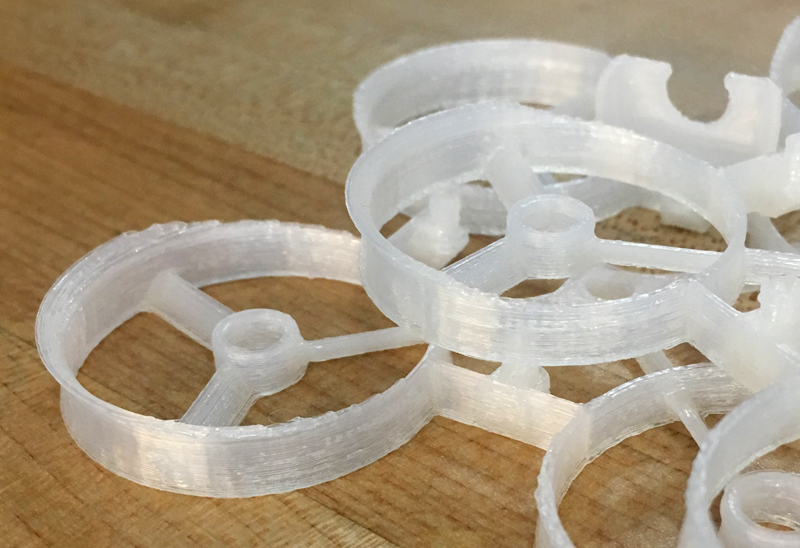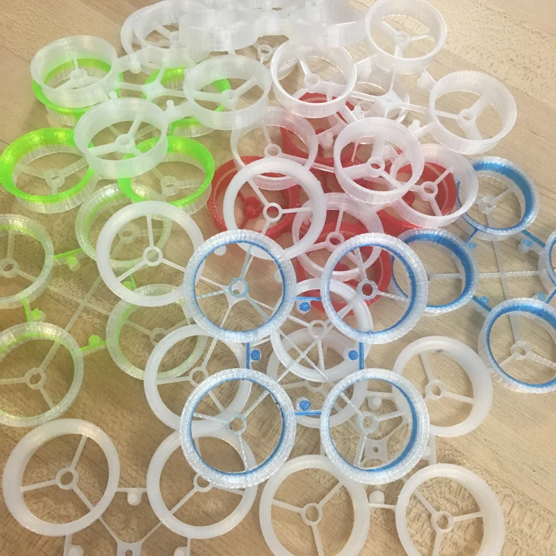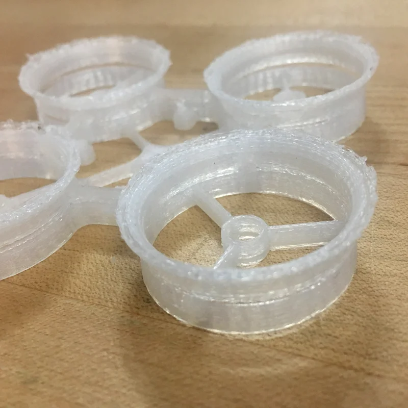 The Tiny Whoop community has an open source-y feel, so I'll post the STL's to Thingiverse. But nylon can be a tricky material so I also want Chris Griffin to sell perfectly optimized prints. I sent him the STL and he started to pick it apart. Weak points that I thought were poor layer adhesion (due to my crap 3d printing skills) turned out to be anomalies in the slicer or bad retraction settings. Chris identified those spots and I redesigned the part to correct them. This has become a real routine for us, where I design something the way I like and Chris makes me change it to print better.