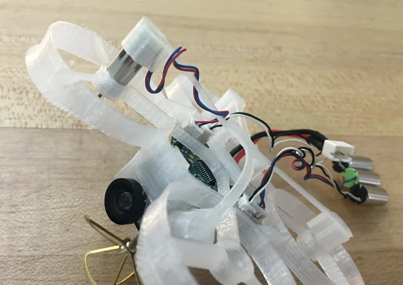 After much trial and error I had a TPU frame that actually flew pretty well LOS on stock motors and super old batteries from my NanoQX. It was a whopping 7.5 g, and I hadn't figured out the battery mount, so I just laid the battery on top of the FC. The motors pushed up from below and stopped against a ridge at the top so I could have the props at the exact height I wanted them. The duct was shaped like a duct should be, but not quite as tall to save weight. The props were as close as I could get them without rubbing. Unlike the 2205's in the LDQ, these motors couldn't just cut through the TPU to create clearance, so they needed a bit more space. The struts were tiny little airfoils, substantially beefier than on the Inductrix. Little TPU booties, motorbutts, slipped over the bottoms of the motors to protect the wires.