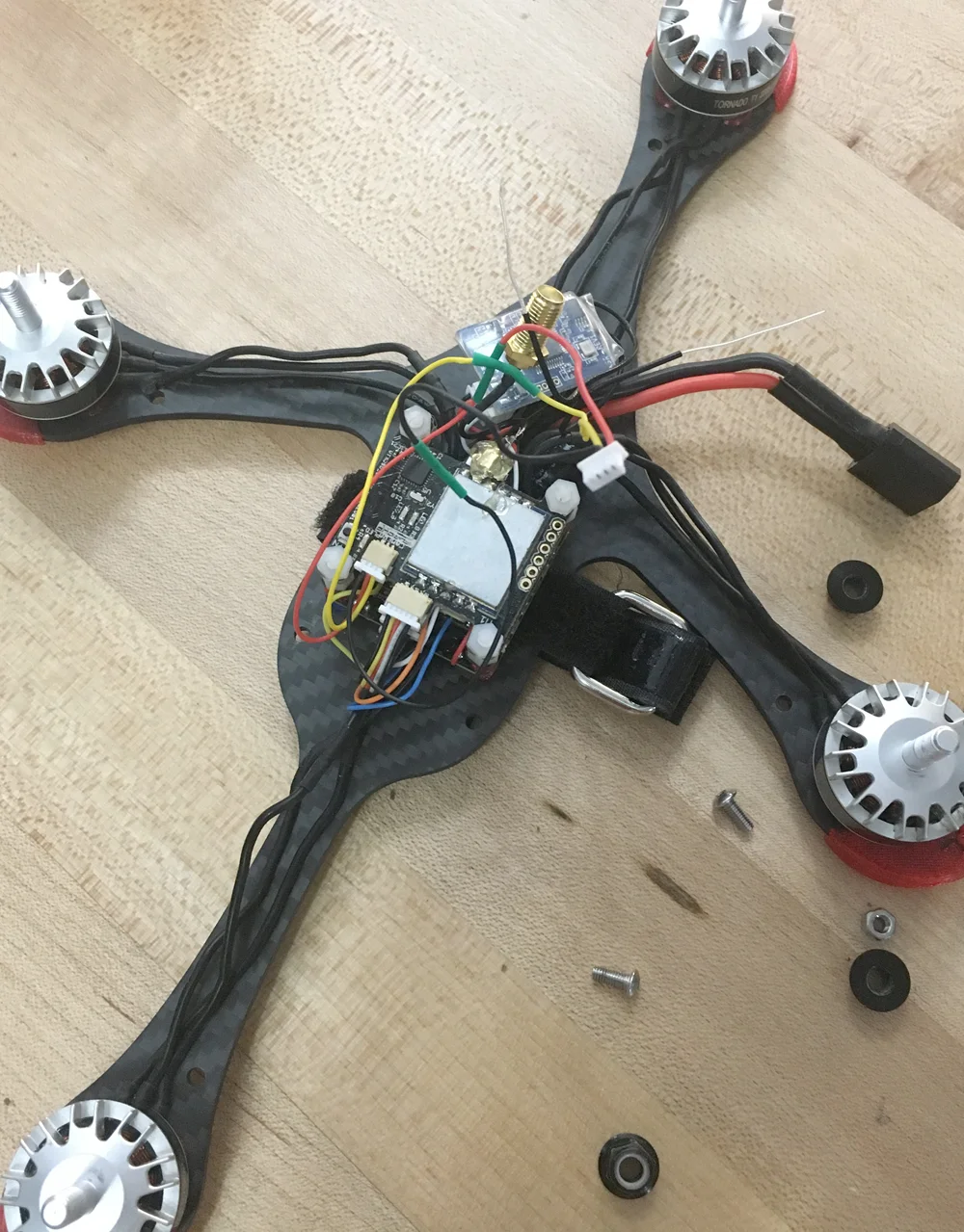 The Mifune has bolts threading into nuts on the main body, while the bolts on the ends of the arms thread directly into the 3d print. I reversed that here, with bolts threading into locknuts at the ends of the arms and threading into the print in the middle. The other big change is that with the esc's mounted vertically the arms are now just 12mm across, which should result in even more thrust savings. I'm going to say it's 'aero and narrow' in the infommercial.
